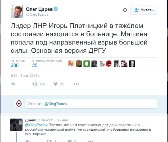 "Лидер ЛНР Игорь Плотницкий в тяжёлом состоянии находится в больнице. Машина попала под направленный взрыв большой силы. Основная версия ДРГУ",