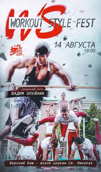 Молодежное движение «STREET WORKOUT NIKOLAEV» проводит в Николаеве спортивное шоу «Workout Style Fest». Начало мероприятия 14 августа в 19:00 возле церкви Св. Николая на бульваре им. Адмирала Макарова («Верхний БАМ»).
