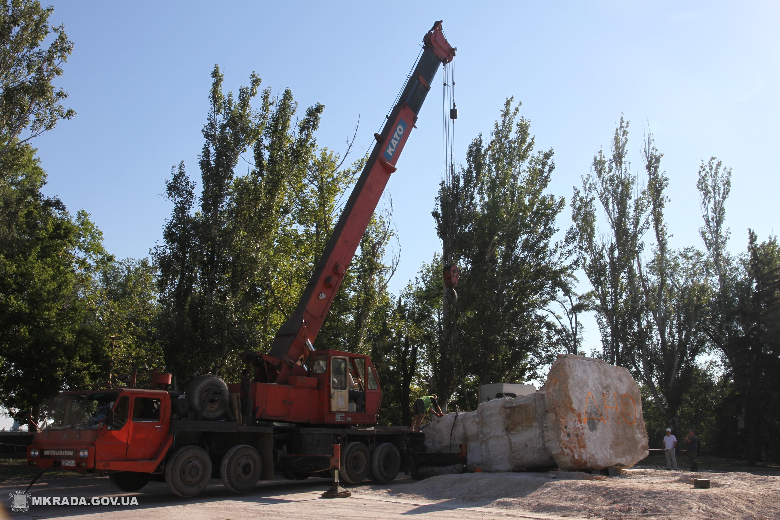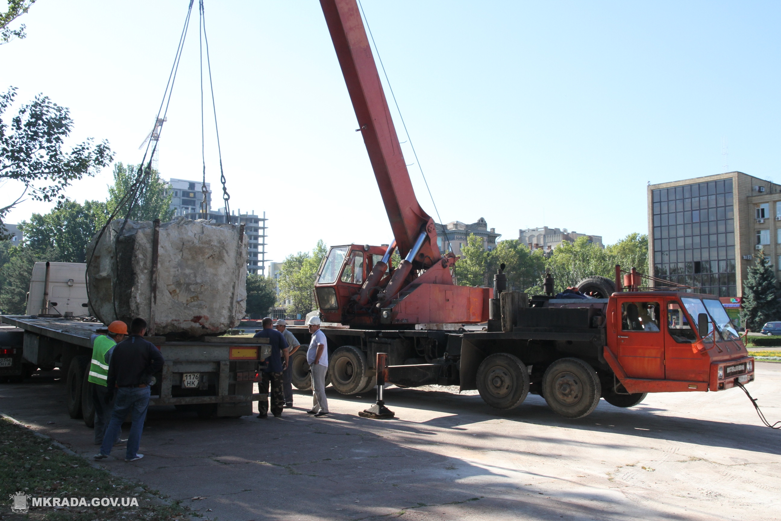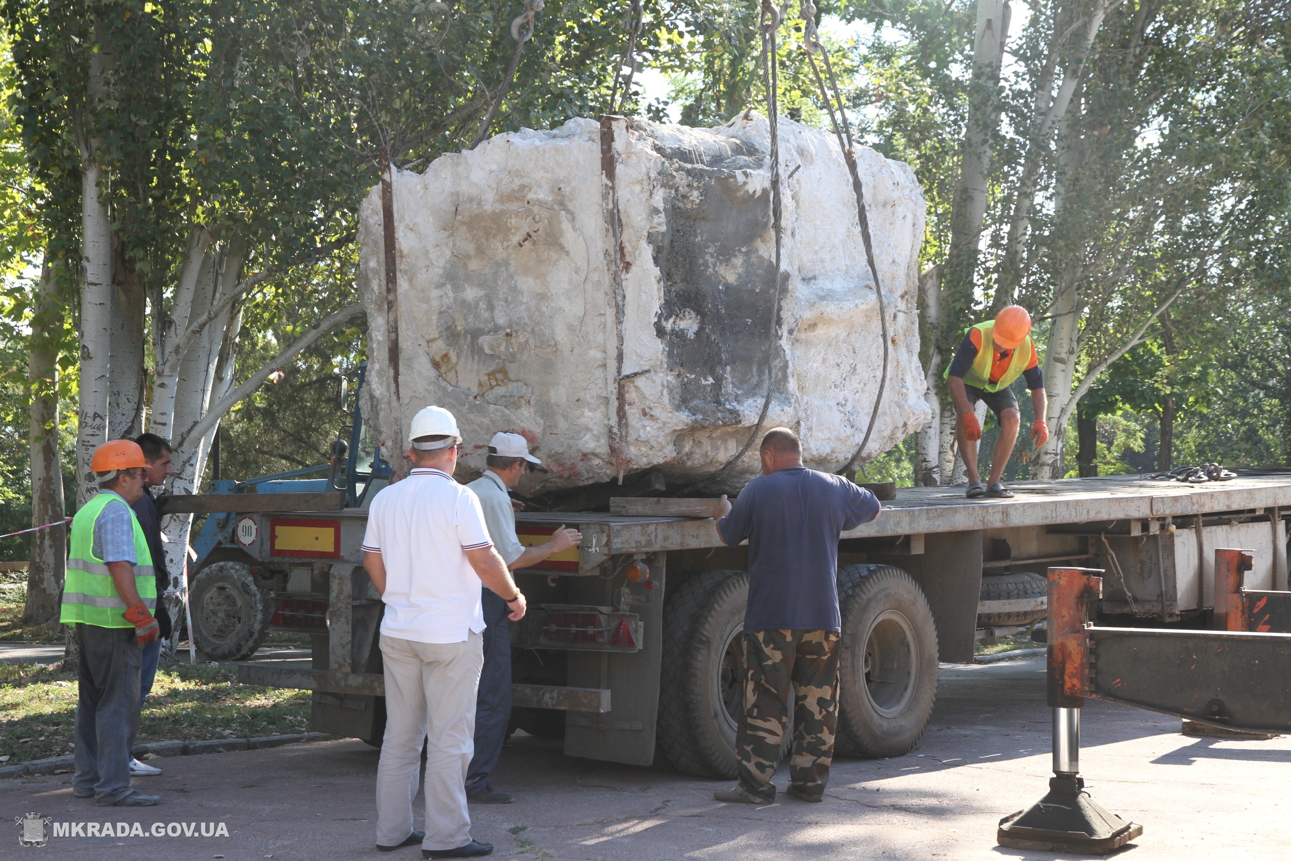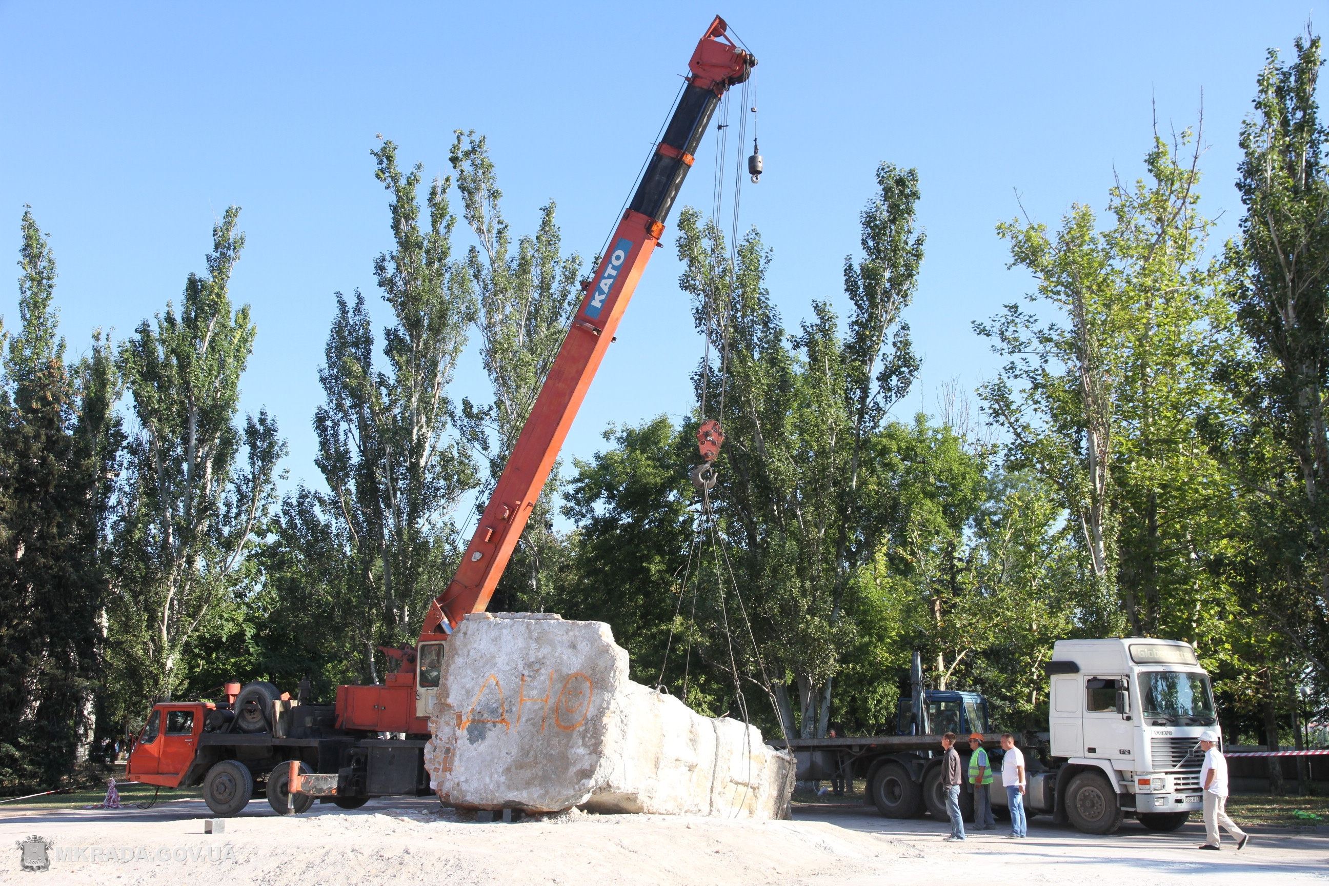 До этого бетонное изваяние, укрепленное арматурой, пришлось распилить на 3 части, поскольку в Николаеве не нашлось крана, способного поднять 60-тонную глыбу для дальнейшей погрузки на трал.