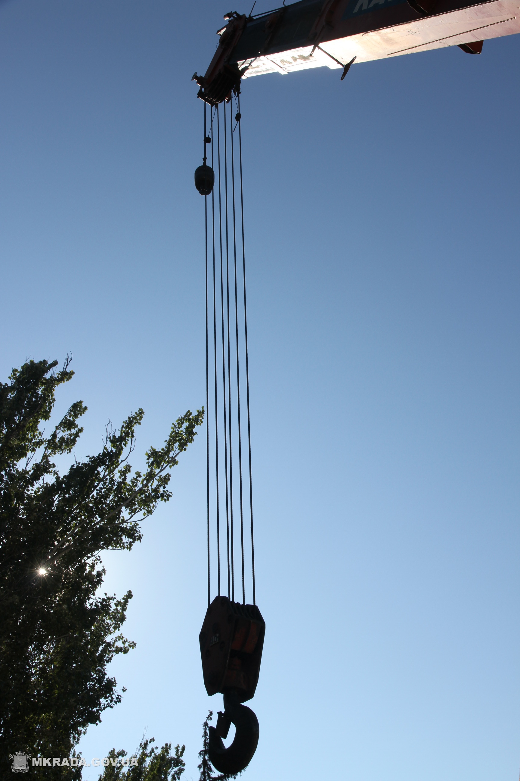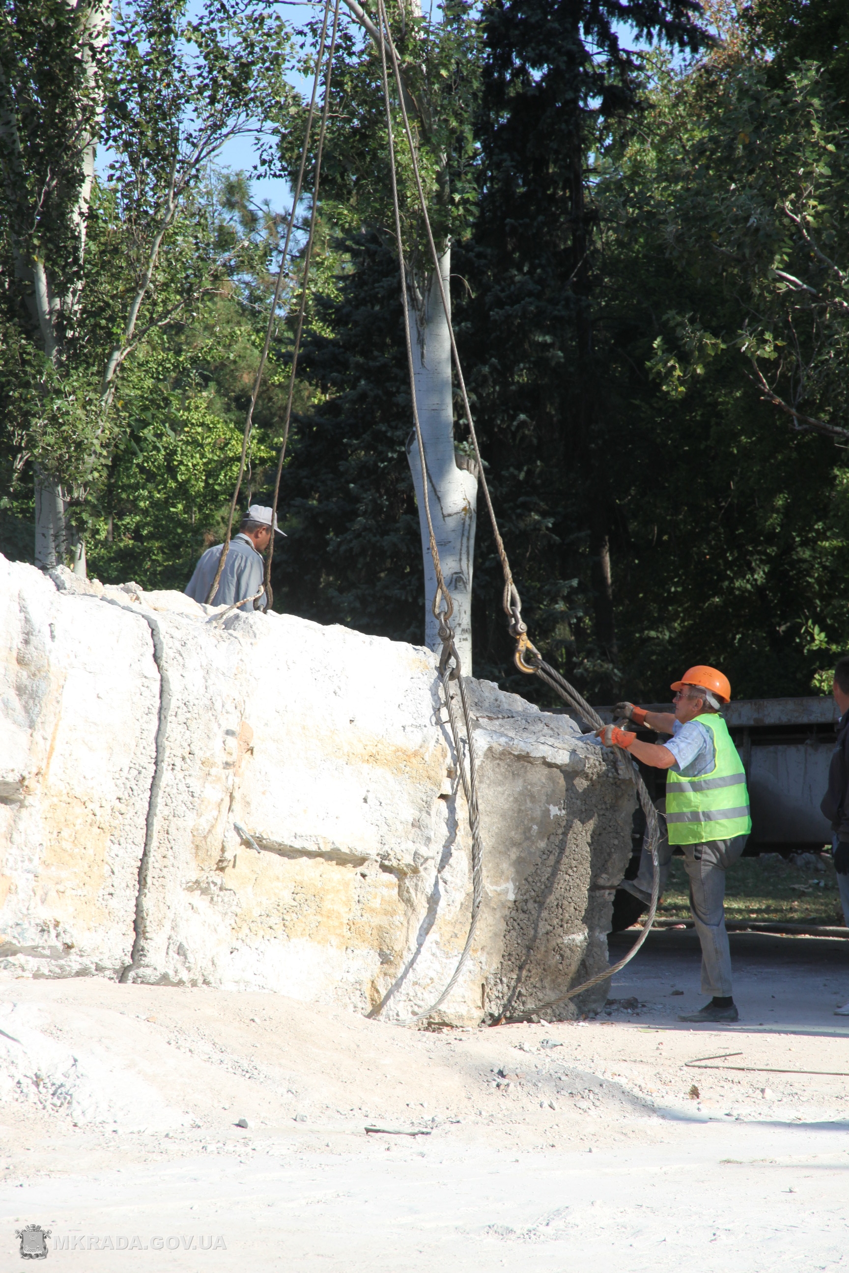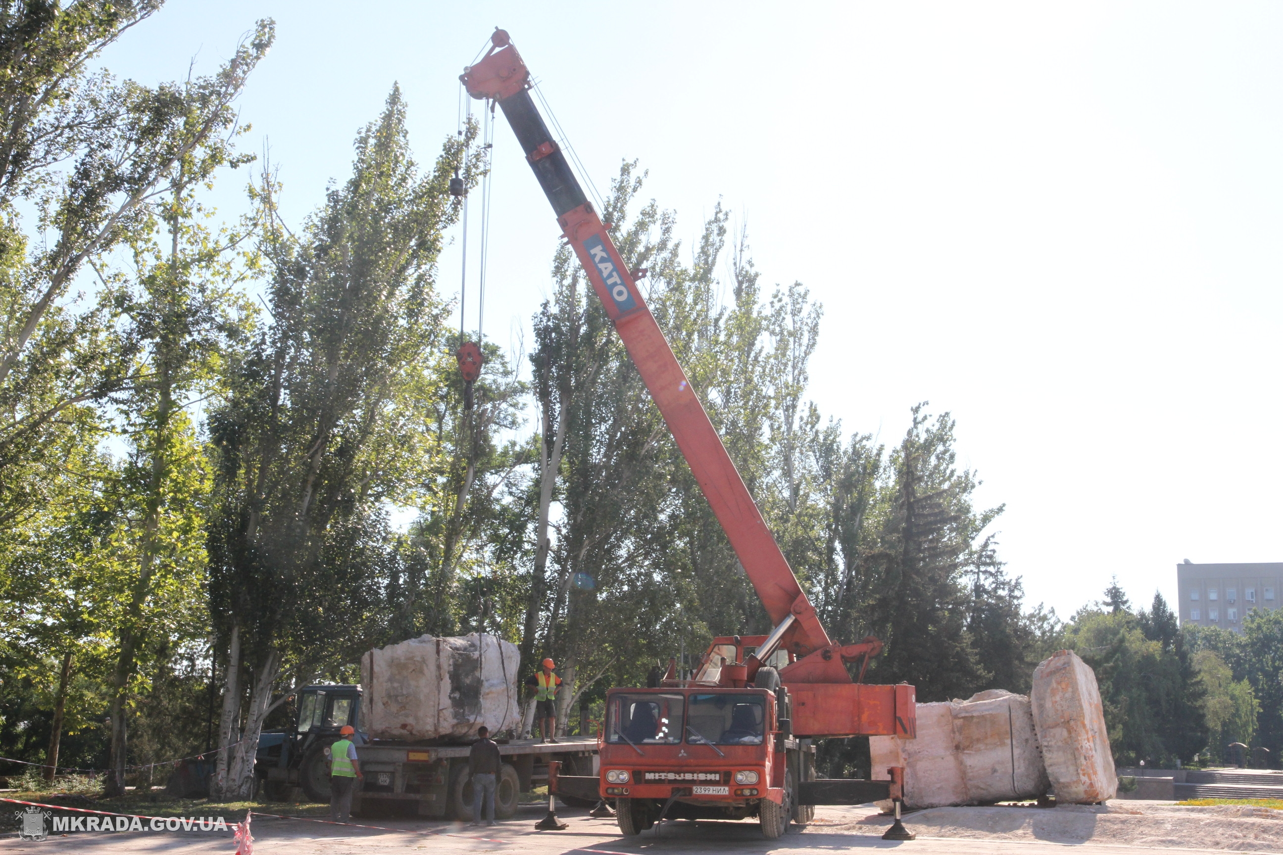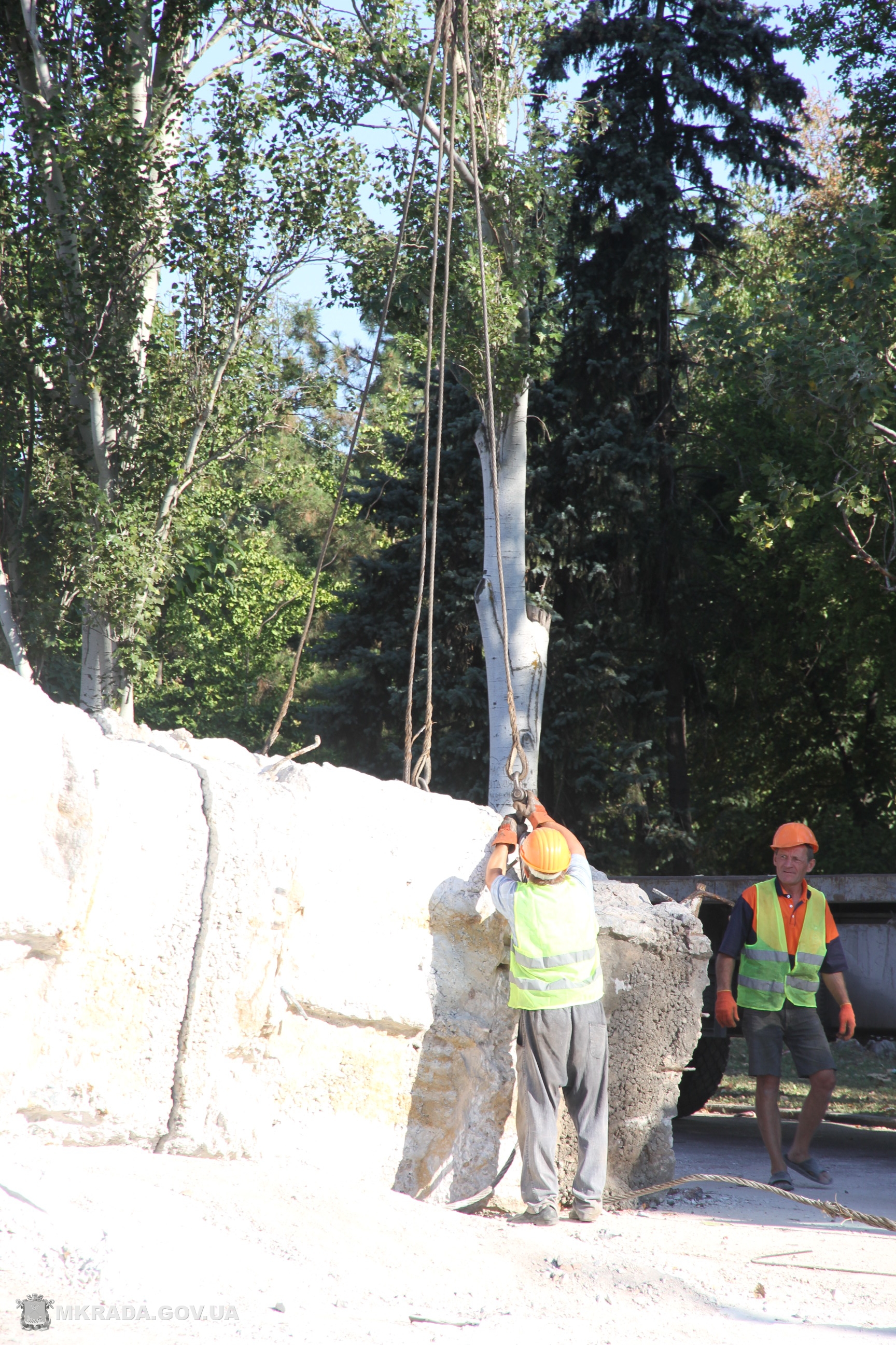 До этого бетонное изваяние, укрепленное арматурой, пришлось распилить на 3 части, поскольку в Николаеве не нашлось крана, способного поднять 60-тонную глыбу для дальнейшей погрузки на трал.