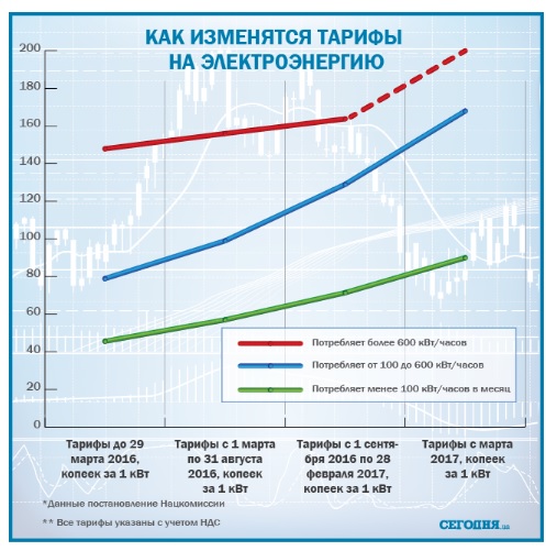 Напомним, что с 1 сентября 2016 года в Украине в очередной раз вырастут тарифы на электроэнергию: при объеме потреблении до 100 кВт/ч стоимость увеличится с 0,57 грн. до 0,714 грн. за 1 кВт/ч; при объеме потреблении от 100 до 600 кВт/ч стоимость увеличится с 0,99 грн. до 1,29 грн. за 1 кВт/ ч; при объеме потреблении более 600 кВт/ч стоимость увеличится с 1,56 до 1,638 грн. за 1 кВт/ч.