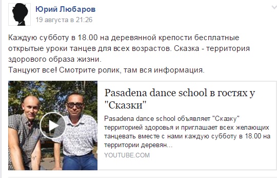 Предлагаю альтернативу вредному времяпровождению детей – танцевальное удовольствие. Танцевать будем в деревянной крепости в детском городке «Сказка» по субботам в 18:00. Ждем всех желающих! – пригласил руководитель «Школы танцев Pasadena» Юрий Вдовиченко.