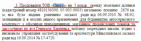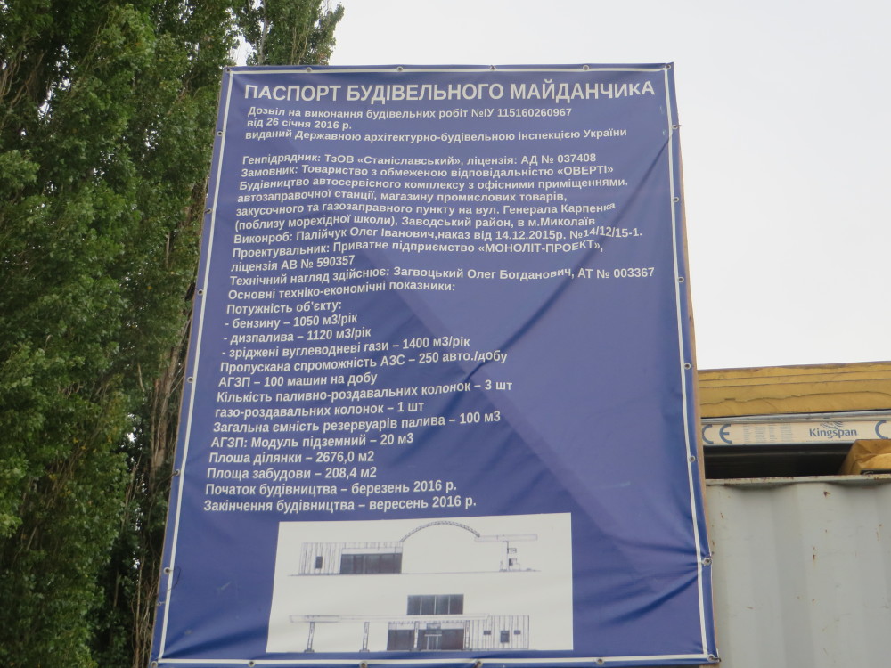 Разрешение на строительство АЗС получило ООО «Оверти», зарегистрированное в Одессе по тому же адресу, что и ООО «Николаевский реабилитационный Центр-Буд», которое пытается построить АЗС возле общежития по пр. Героев Украины, 11 (пр. Героев Сталинграда). Обе фирмы принадлежат ПАО «Концерн «Галнафтогаз» — крупнейшему нефтетрейдеру страны, владельцу сети автозаправок торговой марки «ОККО».
