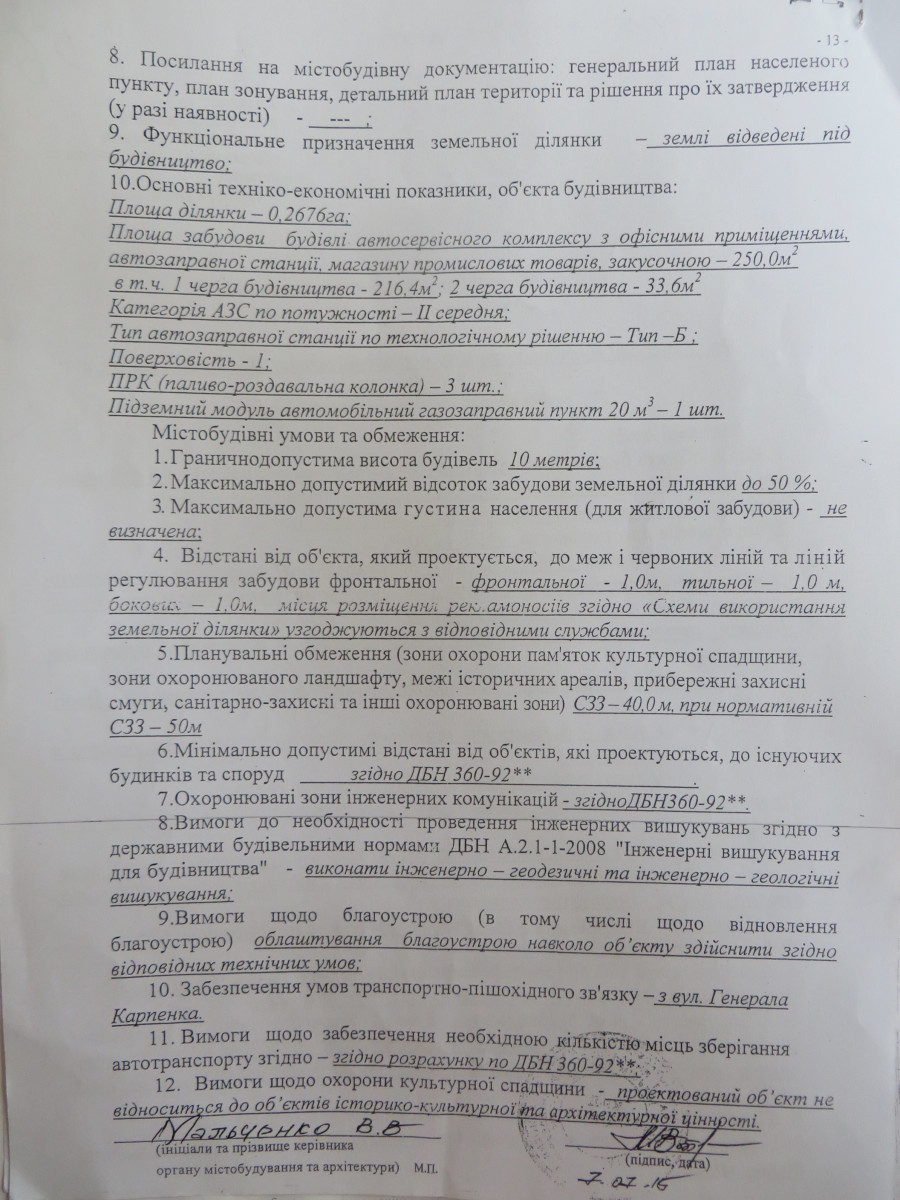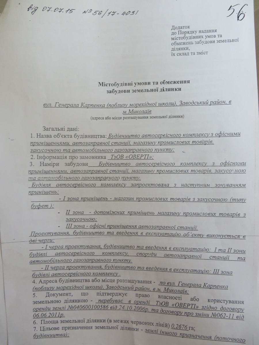 Вопреки принятым решениям горсовета, позволяющим ООО «Оверти» арендовать земельный участок по ул. Генерала Карпенко только для строительства автосервисного комплекса, магазинов промтоваров и закусочной, в управлении архитектуры за подписью бывшего главного архитектора города Валерия Мальченко предприятию выдали градостроительные условия на строительство АЗС.