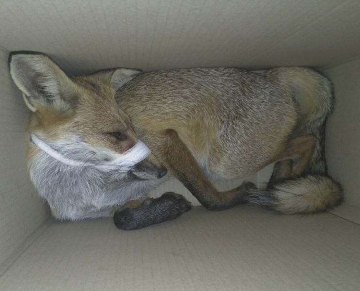 Уже на месте патрульные выяснили, что у лисицы перебиты задние лапы и она нуждается в помощи. Правоохранители наложили жгут на мордочку животного, чтобы оно никого не покусало, и положили в коробку.