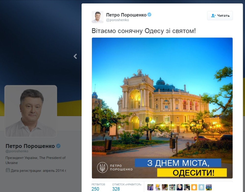Петр Порошенко в Твиттере поздравил одесситов с Днем города