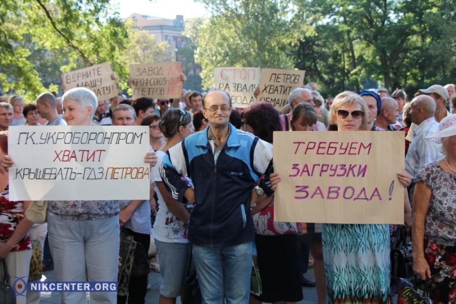 «Мы собрались для того, чтобы с помощью областной государственной администрации добиться от собственника нашего завода ГК «Укроборонпром» решения вопросов по загрузке предприятия, по выплате задолженности по заработной плате, — зачитал обращение к и. о. главы Николаевской ОГА Николай Головченко. — Мы также требуем уволить директора завода Федора Петрова по ст. 45 КЗоТ на основании ранее направленных в ГК «Укроборонпром» требований трудового коллектива», — заявил глава профсоюза.