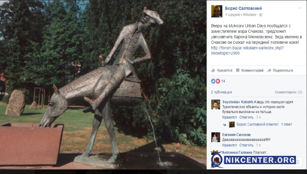 Вчера на Mykolaiv Urban Days пообщался с заместителем мэра Очакова, предложил увековечить барона Мюнхгаузена. Ведь именно в Очакове он скакал на передней половине коня!