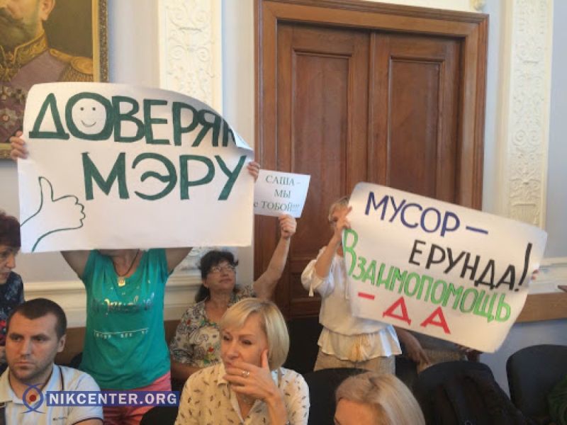 Перед началом пленарного заседания в сессионный зал пришли более 50 активистов, которые выступили в поддержку мэра Николаева. В руках участники акции держали национальную символику и плакаты: «Саша, мы с тобой!», «Мусор — ерунда, взаимопомощь — да!», «Доверяю мэру», «Настоящая свобода — это дружба», «В единении сила», «Мэр, вперёд! Ни шага в прошлое», «Николаев поддерживает Сенкевича».