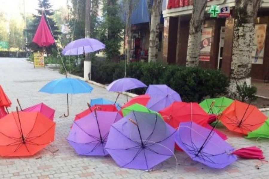 В Скадовске ко Дню города местные активисты собрали средства, купили зонты и из них сделали яркую и оригинальную инсталляцию, которую разместили на одной из центральных улиц города. Инсталляция продержалась недолго. Арт-объект был разрушен.