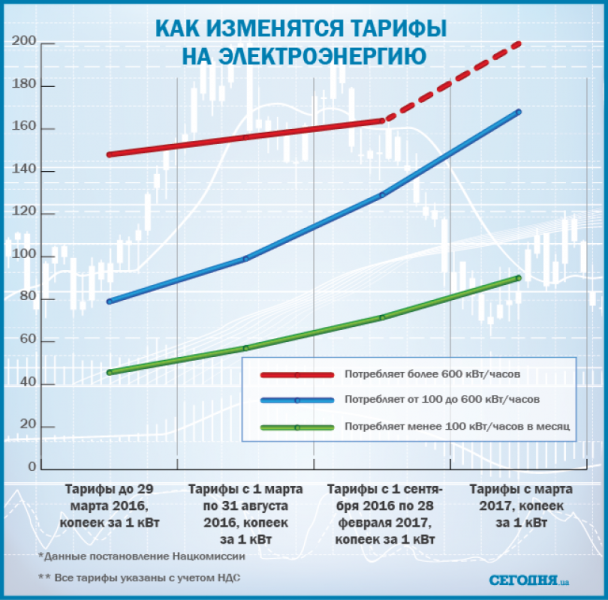 Национальная комиссия, осуществляющая государственное регулирование в сферах энергетики и коммунальных услуг (НКРЭКУ), увеличила розничные тарифы энергоснабжающих компаний на электроэнергию на октябрь 2016 года почти на 10%.