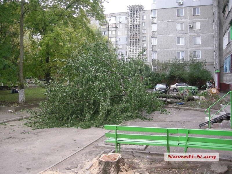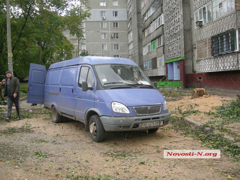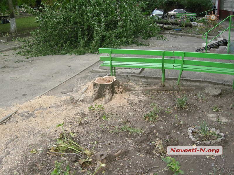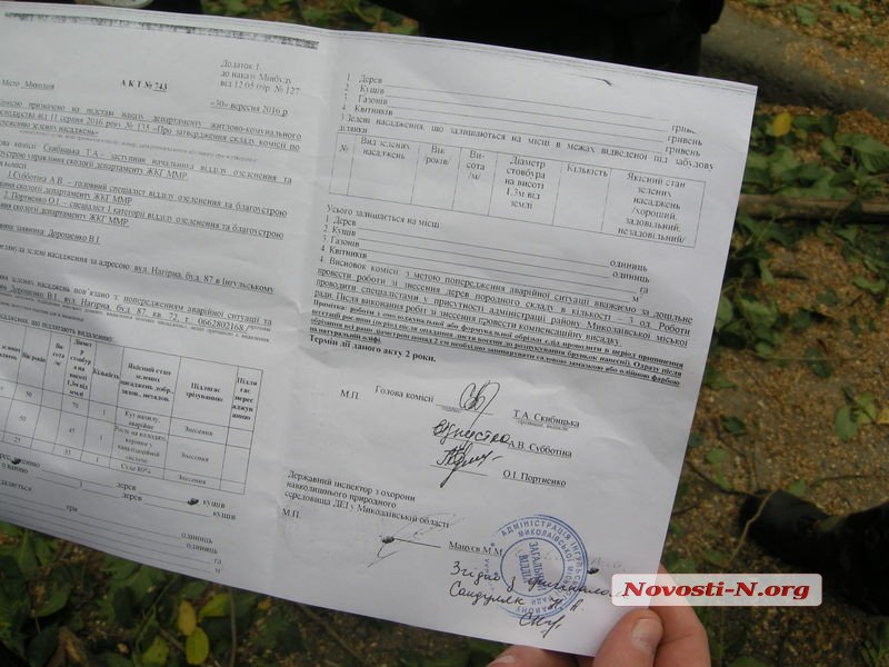 В среду, 20 октября, в редакцию позвонили жители дома № 87 по ул. Нагорной с жалобой: во дворе пилят деревья. Приехав на место, корреспонденты застали типичную картину — свежеспиленные, абсолютно здоровые деревья да пни под окнами. Жители вызвали полицию, которой «лесорубы» предъявили все тот же «Акт обследования», выданный администрацией Ингульского района.