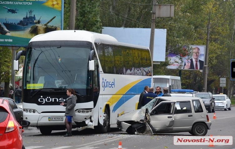 В субботу, 22 октября на проспекте Мира в Николаеве столкнулись рейсовый автобус «Херсон-Киев» и легковой автомобиль Daewoo Tico.