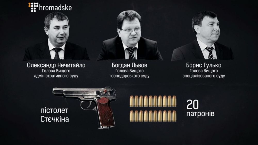 Однако в столице за последние два года отметили немало тыловиков «героев», которые имеют хорошо известные фамилии. В 2015 году владельцами огнестрельного короткоствольного оружия благодаря усилиям министра обороны Полторака стали, например, судьи. Конечно же не рядовые. Председатель Высшего Административного суда Александр Нечитайло, председатель Высшего хозяйственного суда Богдан Львов и председатель Высшего специализированного суда по вопросам по рассмотрению уголовных и гражданских дел Борис Гулько получили по вот такому автоматическом пистолета Стечкина и по 20 патронов на каждого.