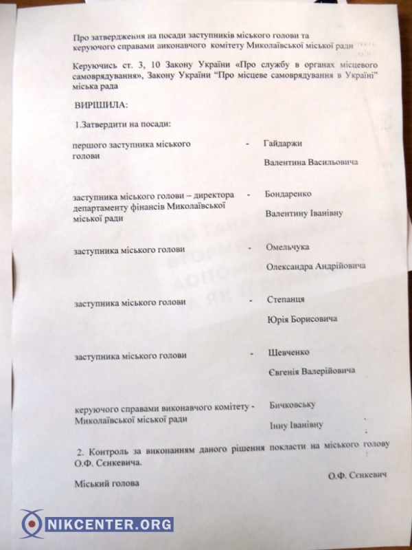 Согласно решению, на должность первого заместителя городского головы был утвержден действующий вице-мэр Валентин Гайдаржи. Должности заместителей Александра Сенкевича заняли депутат от фракции «Оппозиционный блок» Александр Омельчук, а также действующие заместители мэра — Юрий Степанец, Евгений Шевченко и Валентина Бондаренко, которая также является директором департамента финансов городского совета.
