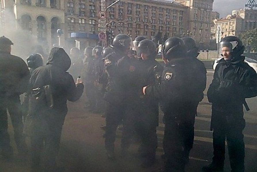 Столкновение между протестующими и стражами порядка началось на пересечении Крещатика и Михайловской, когда полиция попыталась оттеснить вкладчиков с проезжей части. Согласно сообщениям, один из участников акции зажег файер и бросил его в полицейского, попав тому в лицо.