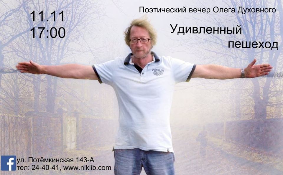 Николаевский поэт Олег Духовный приглашает горожан на свой литературный вечер «Удивленный пешеход», который состоится 11 ноября в 17.00 в Центральной городской библиотеке им. М.Л. Кропивницкого.