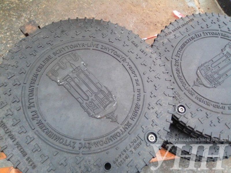 На люках изображена архитектурный памятник Житомира — водонапорная башня, а также надпись «живи Житомиром» на шести языках.