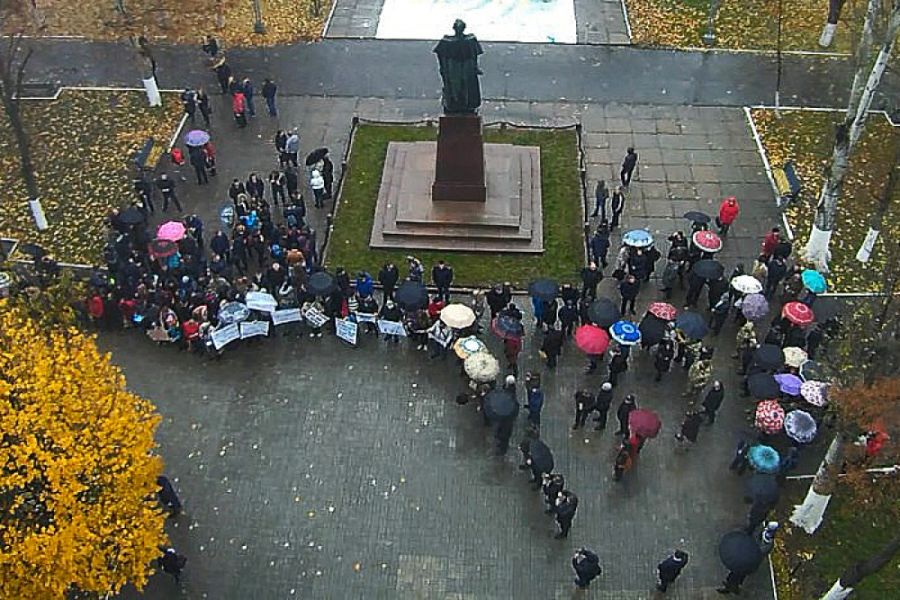 Люди начали собираться возле здания Херсонской морской академии, куда приезжал премьер-министр, за час до запланированного визита. Ближе к моменту приезда главы правительства, собравшиеся развернули принесенные с собой плакаты.