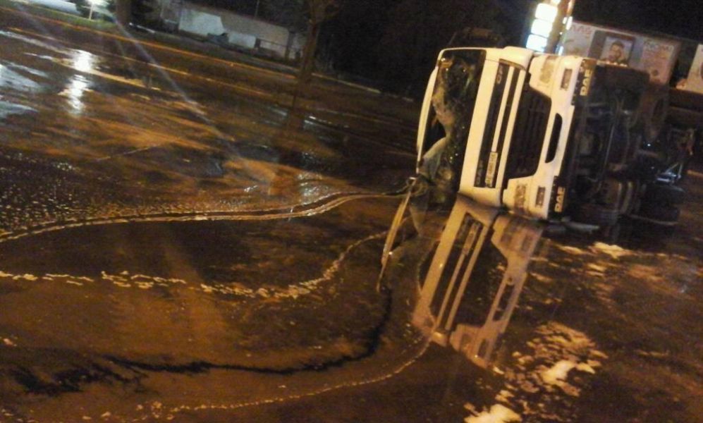 В ночь с 22 на 23 ноября в Николаеве на Херсонском кольце перевернулась фура, перевозившая подсолнечное масло.