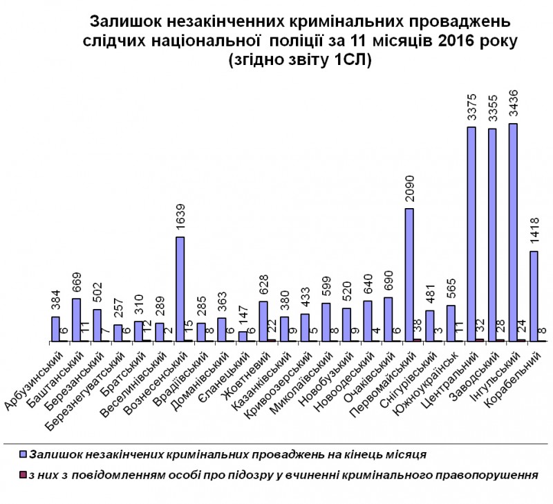 Уменьшилось на 37,2% количество направленных в суд уголовных производств (2621) .С числа направленных в суд обвинительных актов 15 — о преступлениях, совершенных в бюджетной системе. Органами полиции установлено по уголовным производствам убытки, причиненные преступлениями, на сумму 59682 тыс. грн., из которых в ходе следствия возмещено 7579 тыс. грн. По состоянию на 30.11.2016 в производстве следственных подразделений полиции находилось 23782 незаконченных уголовных производств.