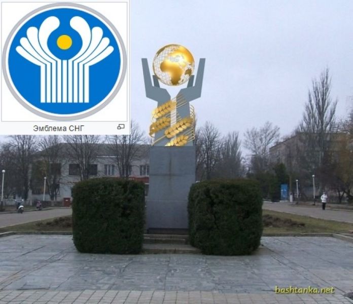 В то же время, установленный в Баштанке памятный знак очень напоминает эмблему Содружества Независимых государств, которая символично изображает белые руки, возносящие к синему небу земной шар золотого цвета.