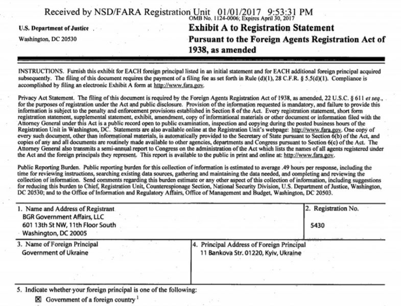 BGR Group подала соответствующую информацию в FARA 1 января 2017 и указала адрес клиента — "Банковая 11 Киев, Украина".