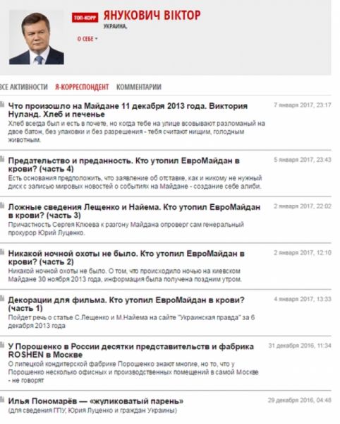 Беглый экс-президент Украины Виктор Янукович завел блог на сайте издания "Корреспондент", в котором пишет "правду" о том, кто виноват в кровопролитии на Майдане, а также "разоблачает" украинскую власть.
