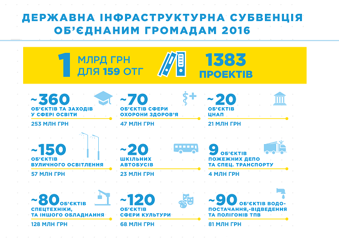 «Мы получили предварительные данные из Госказначейства, которые свидетельствуют, что из одного миллиарда гривен, выделенных государством средств субвенции на развитие инфраструктуры общин, 95% этих средств они вложили в обновление и строительство дорог, зданий школ, детских садов, медицинских учреждений, в строительство центров предоставления админуслуг, спортивных сооружений, освещение улиц, приобретение специализированной техники для коммунальных нужд и т. Все это — развитие территорий общин и создание качественных условий жизнедеятельности для каждого из них жителя, повышение качества услуг. Хотя скептики не верили, что общины справятся с реализацией проектов и освоением выделенных средств на эти проекты, не имея соответствующего опыта. Они справились и доказали, что способны самостоятельно хозяйствовать на своей территории без указаний из района или области. Так реформа местного самоуправления по принципу децентрализации и полномочий, и ресурсов является действенной», — сказал первый заместитель Министра.