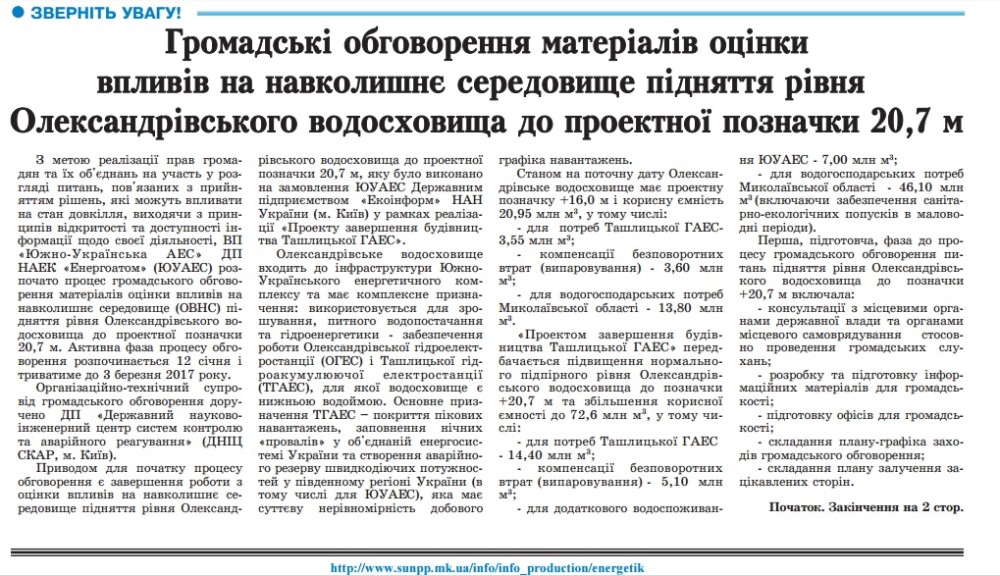 «Ну вот. Началось. А мы думали, что это будет не скоро. Атомщики (ЮУ АЭС) начинают общественные слушания по поднятию уровня Александровского водохранилища до 20,7 м. Это катастрофа для природы, истории, туризма региона и прочего. Общественные слушания нужны для позитивной экспертизы. Понятно, что для местного населения будет много сказок-рассказок. Коллеги, как бы это отразить погромче? Чтоб без боя регион не сдался?» – сообщает Елена Горячева в Фейсбук.
