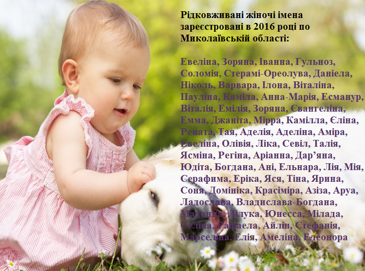 -Встречаются имена, заимствованные из западноевропейских языков, и взятые из популярных произведений зарубежной художественной литературы. В поисках свежих имен, отличных на фоне массовых, супружеские пары обращаются также к древнерусским и славянским сложным именам. Также одним из мотивов, которым определяют избрание имени для младенцев, является чествование именем ребенка выдающихся личностей, литературных и мифических персонажей, киногероев, в том числе героев сериалов, популярных певцов и тому подобное. Также по желанию родителей детям присваивались имена с отступлением от словарной формы, — пояснили выбор николаевских родителей в управлении юстиции.