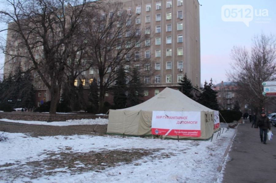 На улице Адмиральской возле здания Николаевской областной государственной администрации 2 февраля поставили палатку для сбора гуманитарной помочи жителям Авдеевки, пострадавшим в результате артиллерийских и ракетных обстрелов со стороны российских боевиков.