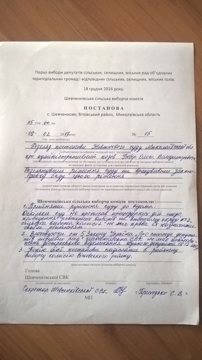 Также, суд пришел к убеждению, что ошибка в бюллетенях повлияла на результаты выборов, поэтому Октябрьский районный суд признал результаты первых выборов депутатов Шевченковской ОТГ 18 декабря 2016 по одномандатному избирательному округу №2 недействительными. Заявление о проведении повторных выборов суд оставил без рассмотрения, поскольку это не входит в его полномочия (согласно ЗУ «О местных выборах» повторные выборы назначает соответствующая территориальная избирательная комиссия).