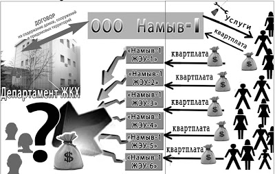 Договор о предоставлении услуг по обслуживанию домов и территорий между собственниками квартир заключен только с ООО «Намыв-1». В то время как сбор квартплаты осуществлялся, помимо «Намыв-1», еще и 6 созданными предприятиями.
