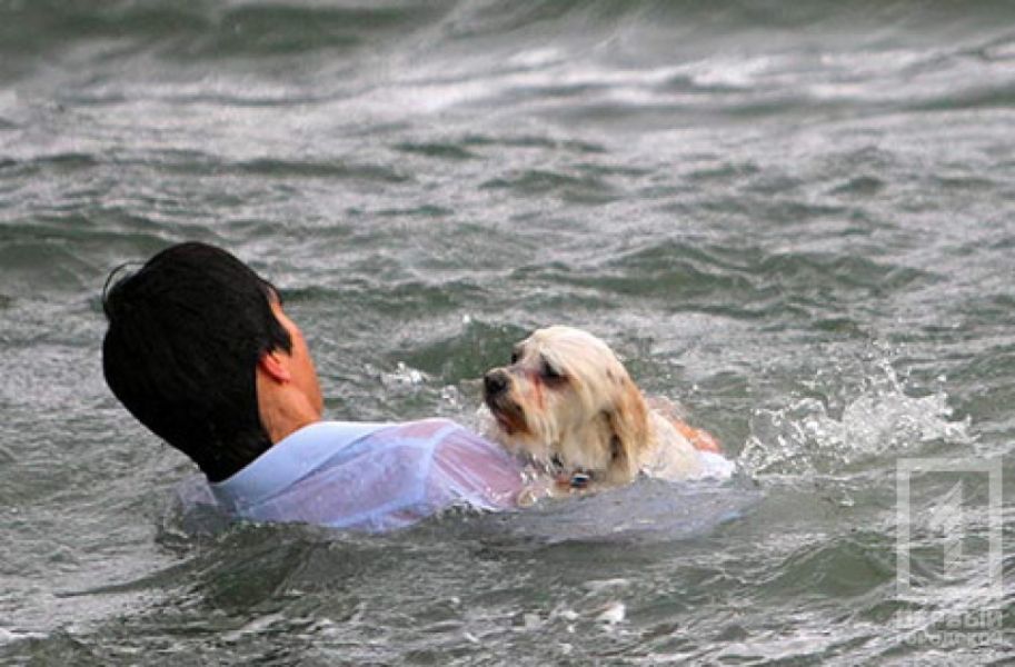 Собака, сорвавшись с пирса, упала в воду, и хозяин прыгнул за ней.