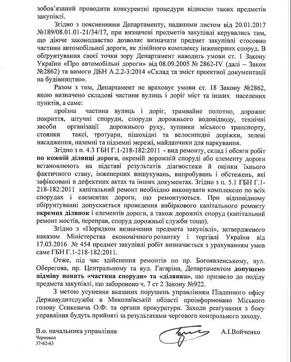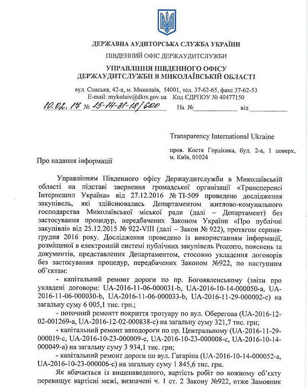 «Правда, Департамент ЖКХ решил разбить все закупки ремонтов на более мелкие суммы. Это позволило заключить договоры с конкретными организациями без торгов через подмену понятий «часть сооружения» и «участок». Такая игра слов будто помогла разбить закупку на несколько закупок, что запрещено ЗУ «О публичных закупках». Мы это заметили. 27 декабря 2016 года Transparency International Ukraine обратилась в Государственную аудиторскую службу и к Генеральному прокурору Украины. Государственная аудиторская служба в письме от 10 февраля 2017 года подтвердила выявленные нарушения и в свою очередь проинформировала органы прокуратуры и мэра Николаева», – говорится в сообщении сайта.