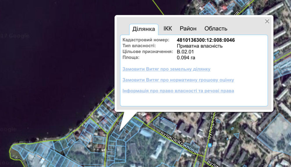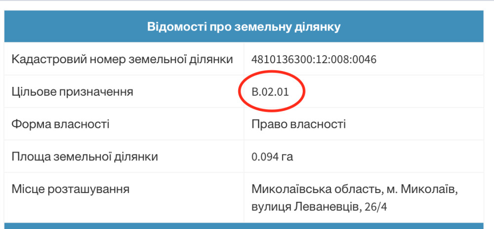 По данным Госгеокадастра Украины, земельный участок, на котором осуществили спил деревьев, находится в частной собственности. Целевое предназначение земли — для строительства и обслуживания жилого дома, хозяйственных зданий и сооружений (приусадебный участок).