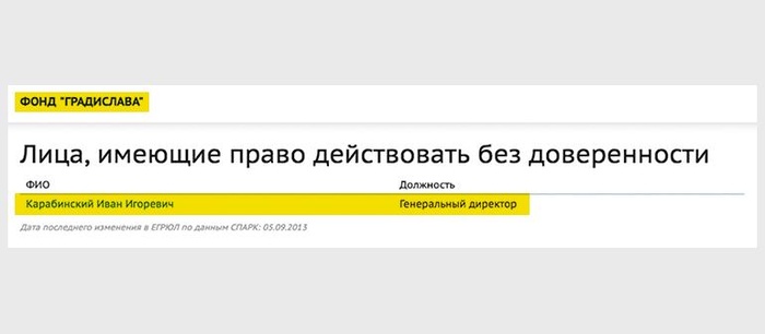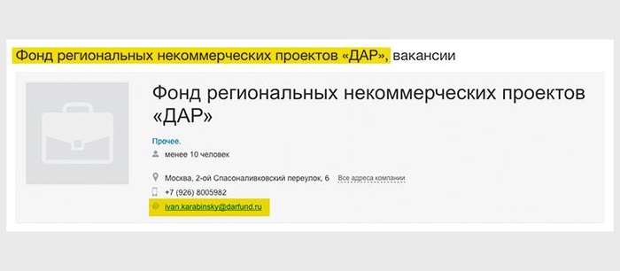 Директор «Градиславы» Иван Карабинский на самом деле сотрудник фонда «Дар» с корпоративным имейлом на домене darfund.ru.