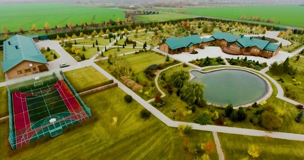 Главный дом площадью около полутора тысяч квадратных метров, гостевой дом, две вертолетные площадки, декоративный пруд, спортивный корт — полный комплект.
