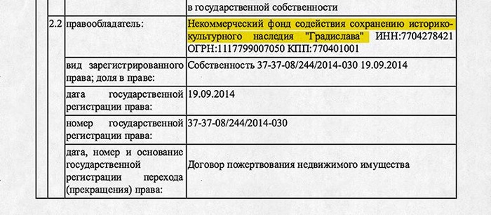 Еще один аргумент мы видим в выписке из реестра недвижимости. В ней сказано, что «Дар» просто подарил старинную усадьбу «Градиславе». Невозможно представить себе, чтобы некоммерческий фонд мог вот так запросто отдать посторонней организации старинную усадьбу такой стоимости.
