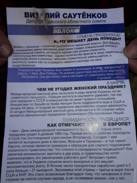«Ходят, раздают всякую гадость, — написали «автомайдановцы» на своей странице в «Фейсбуке». — Раскачивают ситуацию. Покоя им, видите ли, праздники не дают. 8 марта уже прошло, но жопоблок (так в тексте, — Ред.) не оставляет надежду нагадить. Ходят по селам Одесской области, ходоки блин.