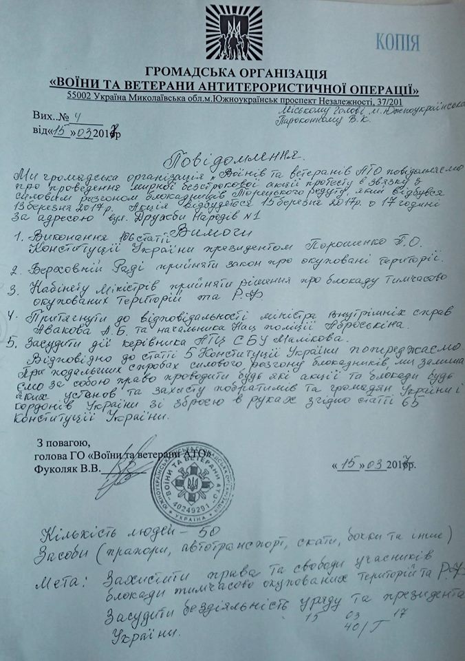 — «Предупреждаем, при дальнейших попытках силового разгона блокадчиков, мы оставляем за собой право проводить какие либо акции и блокады любых учреждений для защиты побратимов и граждан Украины, границ Украины с оружием в руках», — отмечается в письме.