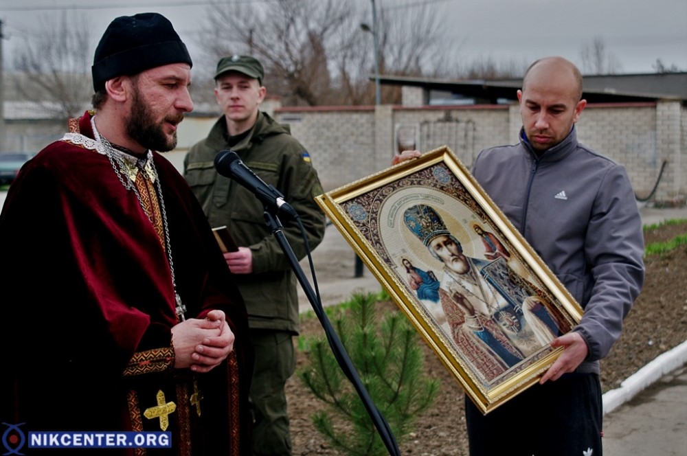 Памятник освятил капелан воинской части о. Максим. Он подарил подразделению икону св. Николая Чудотворца.