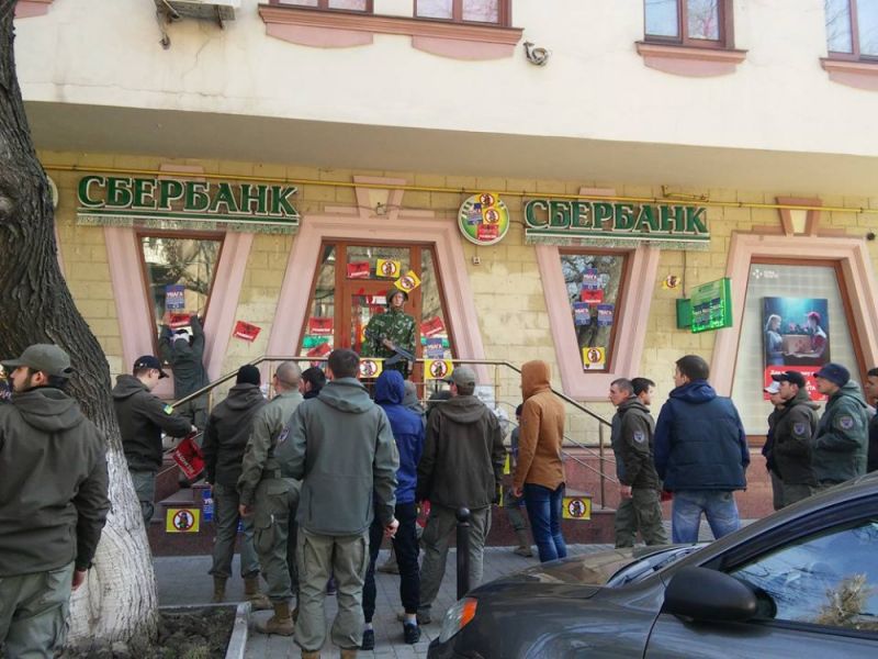 Сегодня, 3 апреля, порядка 25 граждан, которые представились активистами «Автомайдана Одессы», заложили пенобетонными блоками часть входа в отделение одного из банков на улице Пушкинской.