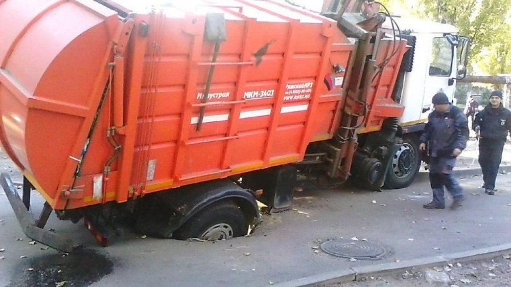 В Николаеве мусоровоз провалился в дыру в асфальте