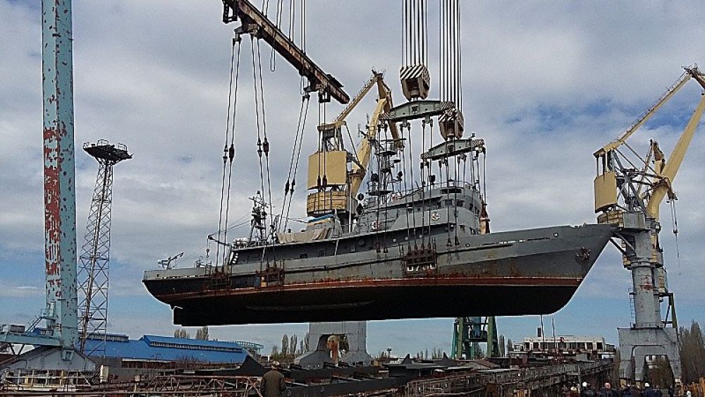 На Николаевской площадке компании «Smart Maritime Group» (Черноморский судостроительный завод), для выполнения ремонтных работ, с помощью финского крана «KONE» грузоподъемностью до 900 тонн, подняли на околостапельную плиту стапеля "0" морское водолазное судно U700 «Нетешин» Военно-Морских Сил Украины.