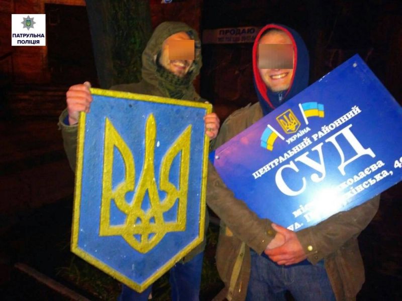 Остановившись и подойдя к мужчинам, инспекторы увидели, что другой держит в руках табличку с административного здания районного суда. По словам мужчин, эти вещи они нашли возле мусорного бака. В дальнейшем 27-ми и 29-летних мужчин патрульные доставили в отдел полиции.