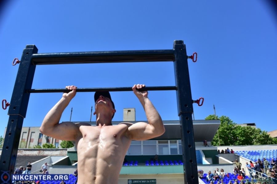 Бег, подтягивание на перекладине, поднятие гирь и других тяжестей, упражнение на тренажере «Гребля» входят в программу чемпионата Сухопутных войск Вооруженных Сил Украины по кросфиту, проходящего в Херсоне, на стадионе «Кристал».