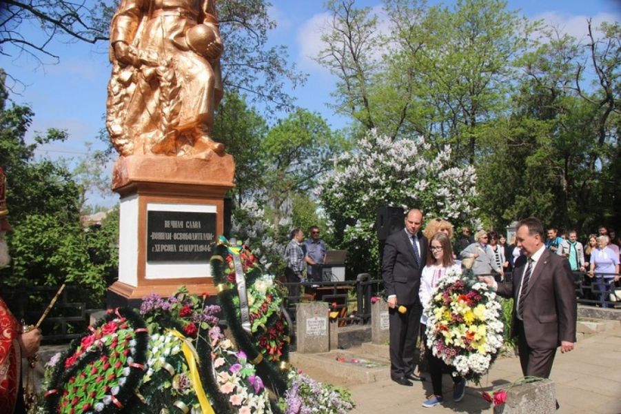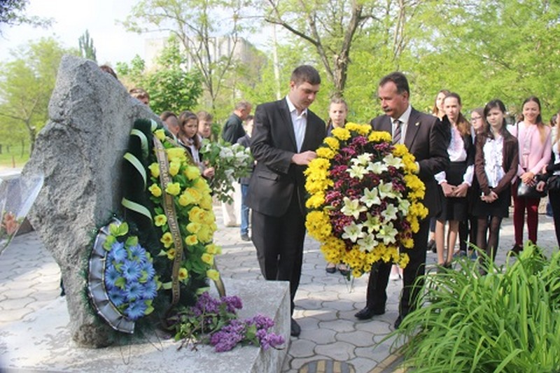 Ученики школ города, члены ученического парламента, Херсонский городской голова возложили цветы к памятному знаку от имени граждан Херсона.