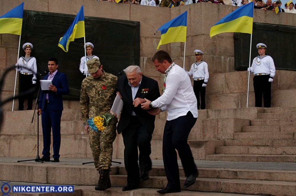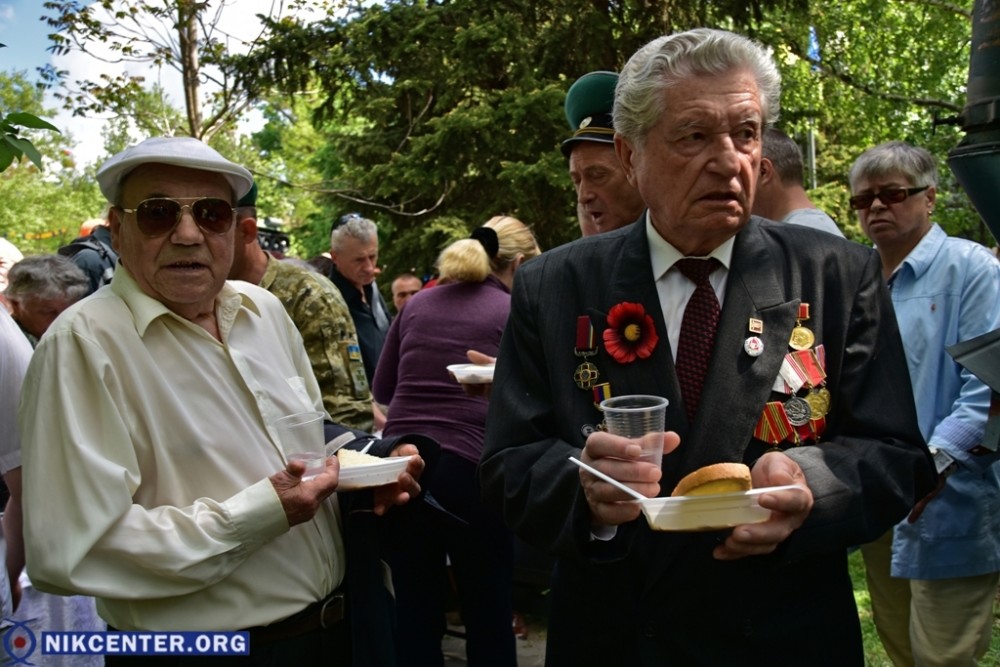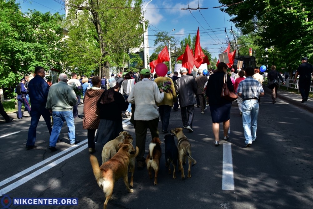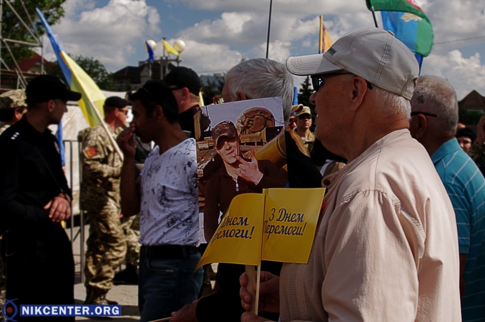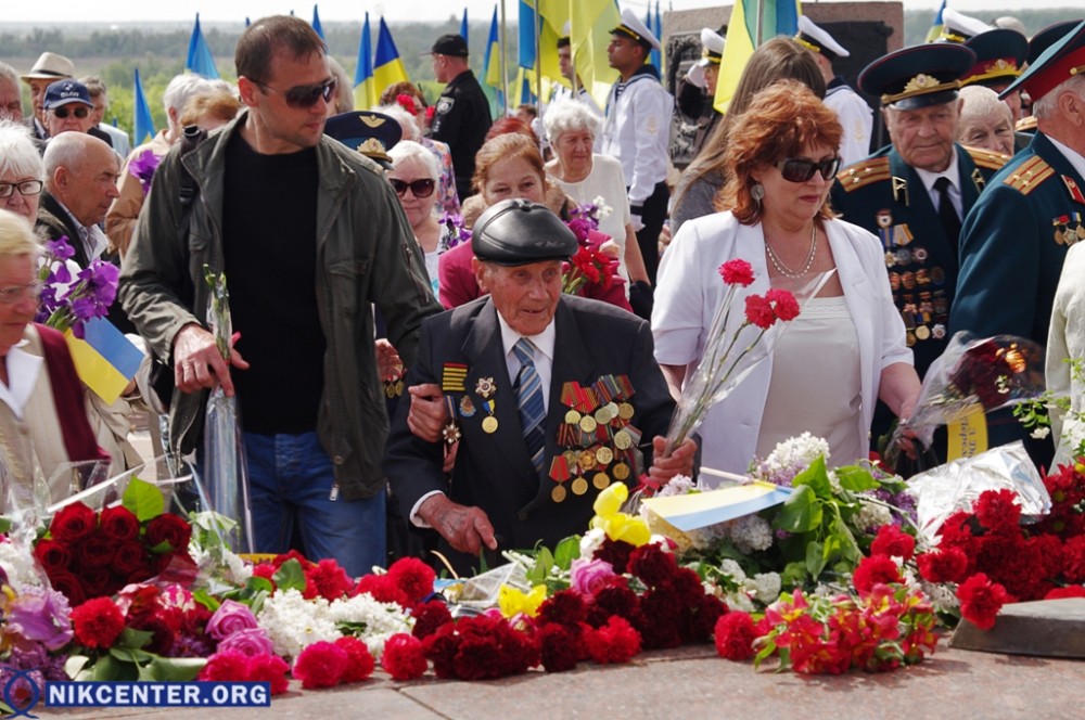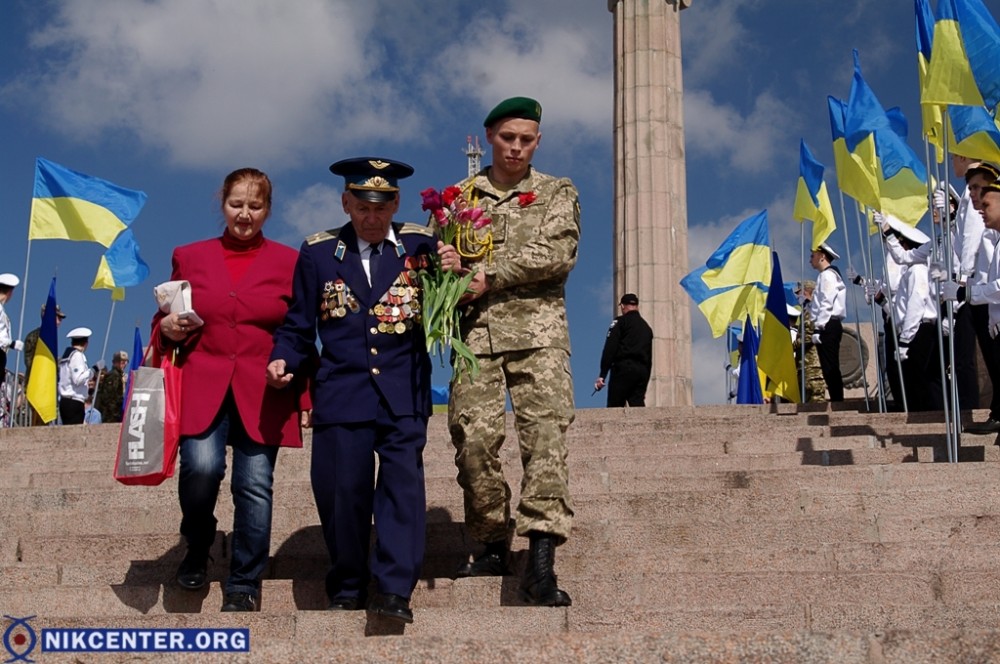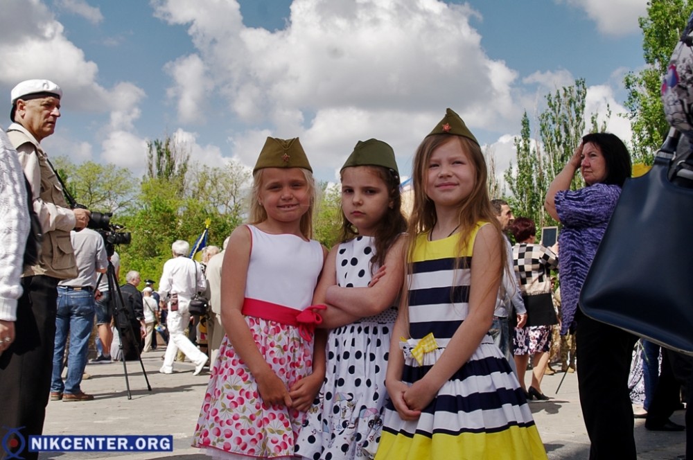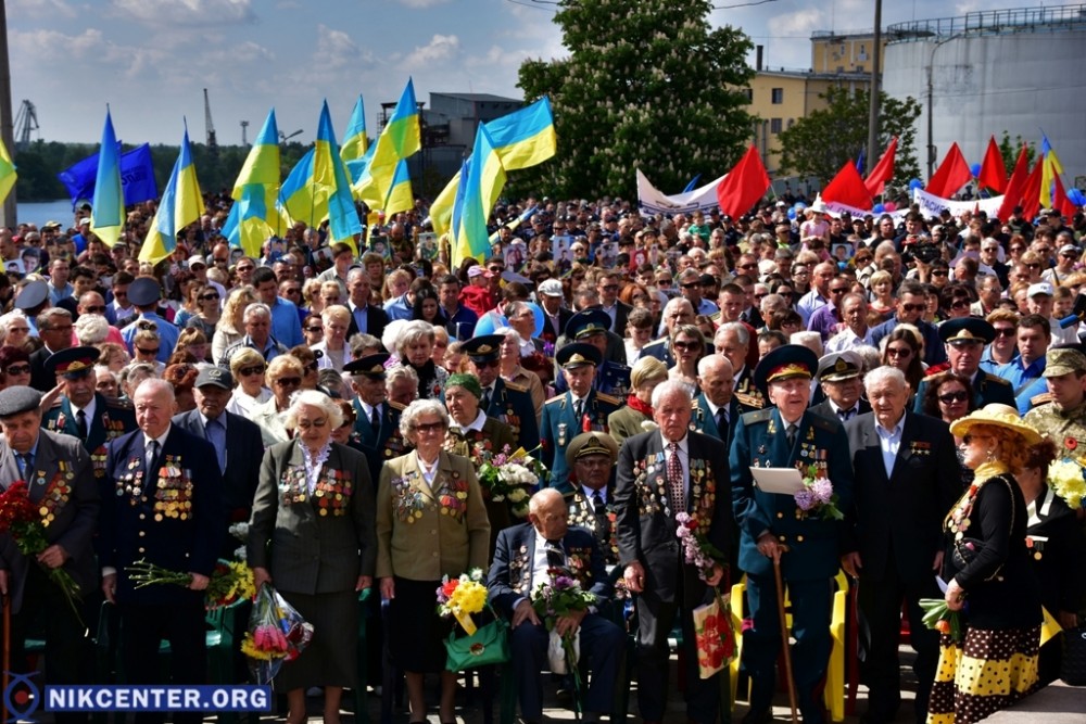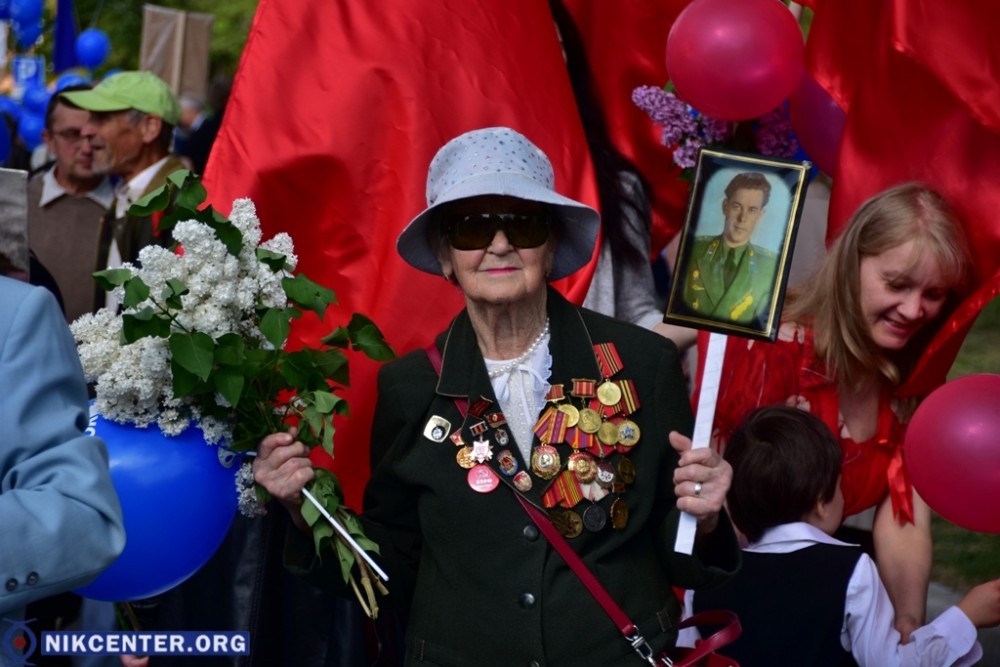 Началось празднование с традиционного шествия, начавшегося от Площади Героев. Сначала во главе шествия шли сторонники левых политических сил, которые провели пропагандистскую акцию «Бессмертный полк». Но возле мемориала «Слава Украине» к ним присоединились проукраински настроенные активисты, прошедшие во главе колонные до набережной Парка Славы, где был проведен торжественный митинг. В качестве альтернативы «Бессмертному полку» некоторые херсонские активисты несли портреты земляков, погибших в зоне АТО.